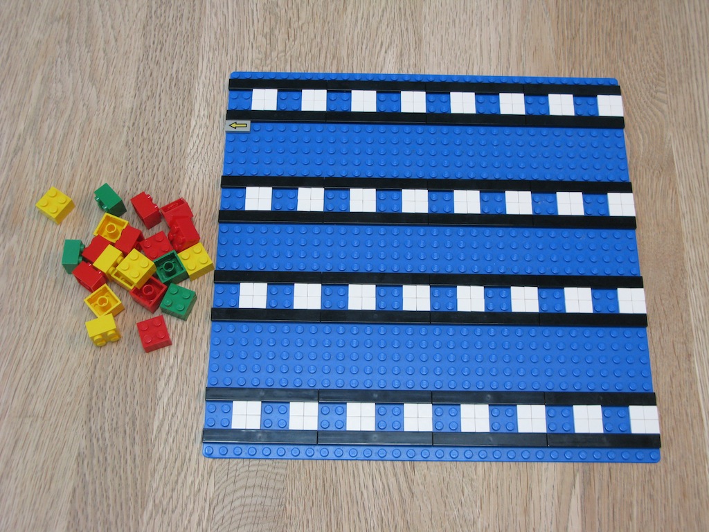 A plate is used to “build” the music tracks. The plates are regular blue 32×32 LEGO base plates, and the notes are LEGO 2×2 bricks. White tiles are used to separate the notes on the plate, and the sensors use a black reading to detect the start and end edge of the plate. The standard LEGO colour sensor can detect 6 basic colours, leaving Red, Yellow and Green to encode notes. The notes are arranged in 4 parallel tracks aligned with the colour sensors.